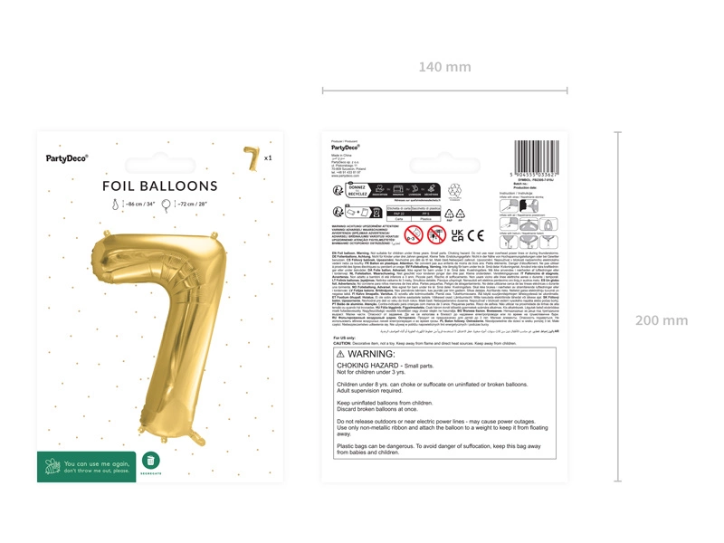 - Balon foliowy satynowy Cyfra ''7'' w kolorze jasnozłotym, rozmiar przed napompowaniem ok. 86 cm (34''), rozmiar po napompowaniu ok. 72 cm (28''). Do napompowania powietrzem i helem. Zestaw zawiera słomkę.