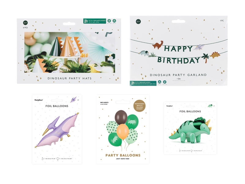 - Zestaw dekoracji party zawiera: 5x Baner Happy Birthday Dino, 3 m, mix (1 op. / 1 szt.), 5x Czapeczki Dinozaury, 14 cm, mix (1 op. / 6 szt.), 5x Balony 30 cm, Dinozaur, mix (1 op. / 6 szt.), 5x Balon foliowy Triceratops, 101x60.5cm, zielony (1 op. /