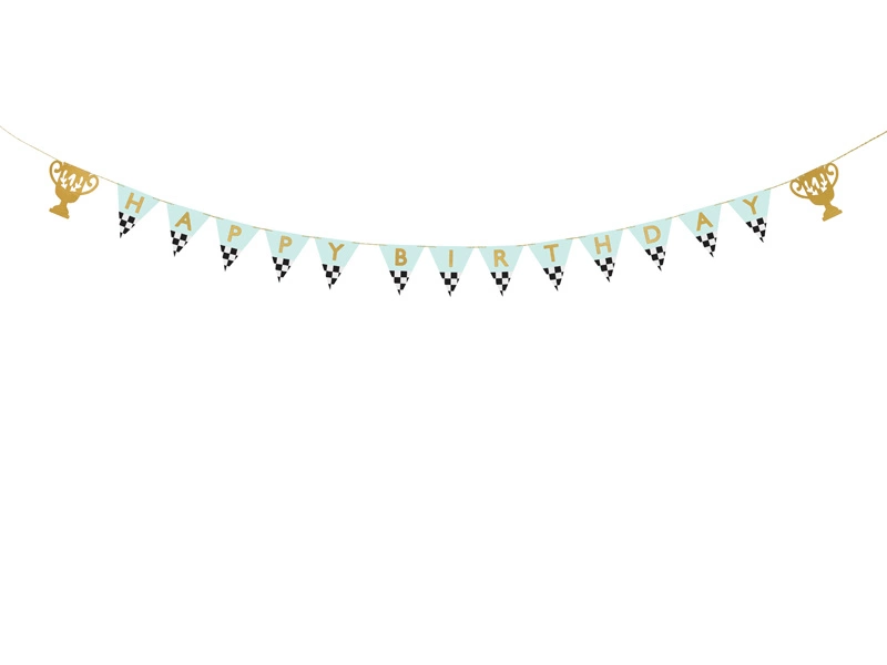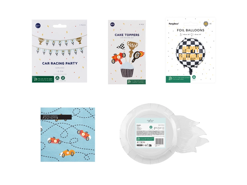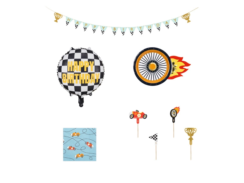 - Zestaw dekoracji party zawiera: 5x Talerzyki Koło, 26.5x18 cm, mix (1 op. / 6 szt.), 5x Balon foliowy Szachownica Happy Birthday, 45 cm, mix (1 op. / 1 szt.), 5x Serwetki Autka, 33x33, mix (1 op. / 12 szt.), 5x Baner Happy Birthday Puchary, 2.5 m, mi