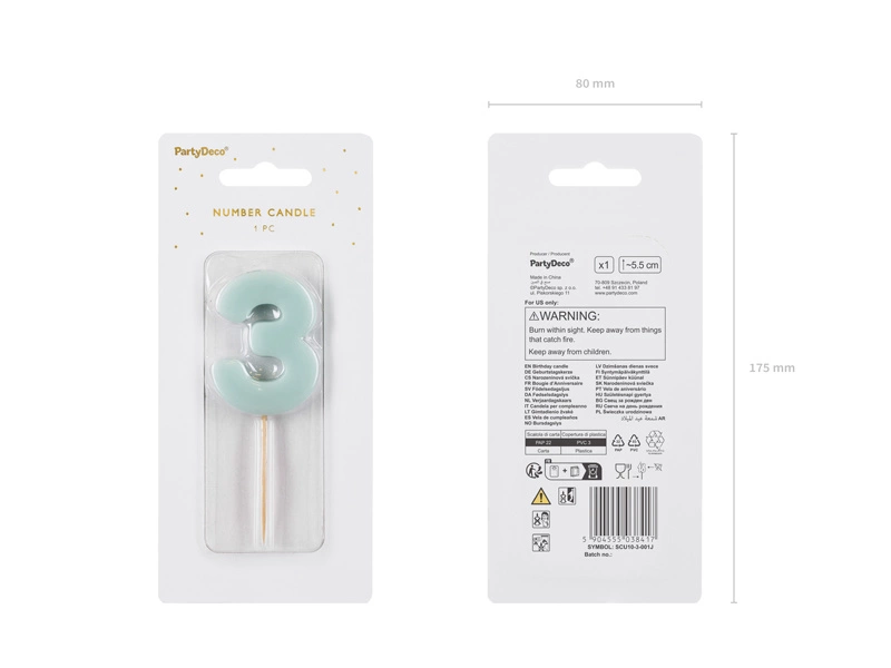 Rozświetl urodzinowy tort z naszą wyjątkową świeczką urodzinową w kształcie cyferki 3! Ta elegancka świeczka w jasnoniebieskim kolorze o wysokości 5.5 cm to doskonały dodatek na każde urodziny, wnosząc radość i kolor do każdej imprezy.