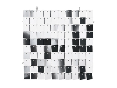 - Panel cekinowy, cekiny w kształcie kwadratów, w kolorze srebrnym, wymiar ok. 30x30 cm. Panele cekinowe posiadają zatrzaski na bokach, które umożliwiają łączenie paneli kwadratowych w spójną całość – patrz instrukcja na karcie produktu. Połączone panele id
