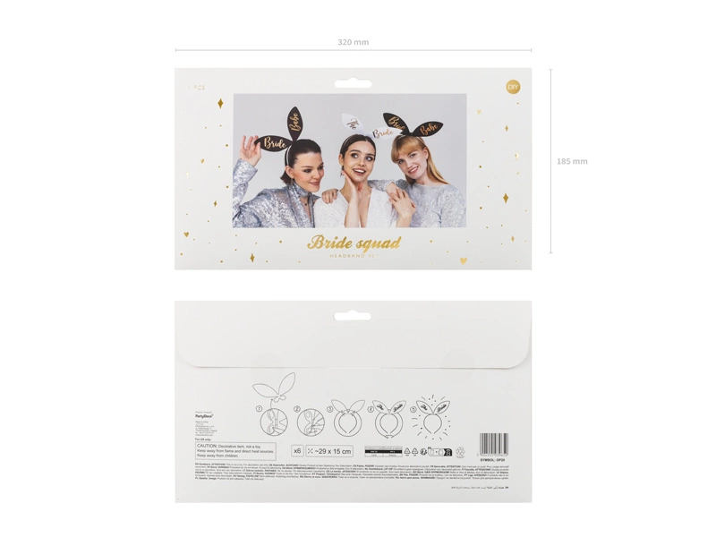 Wieczór panieński to czas, kiedy Bride Squad musi błyszczeć! Dziewczyny pragną się bawić na całego, a odpowiednie akcesoria mogą uczynić ten wieczór jeszcze bardziej wyjątkowym. Nasz zestaw opasek na głowę dla panny młodej i jej druhen to doskonały sposób, aby wyróżnić się z tłumu i dodać wieczorowi panieńskiemu niepowtarzalnego charakteru. W zestawie znajdziesz 6 opasek z uszkami Bride Squad: 5 w kolorze czarnym i 1 w kolorze białym. Wymiary opasek to około 15 x 29 cm.
