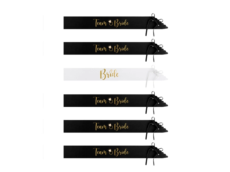 - Zestaw szarf satynowych: 1 szt Bride to be w kolorze białym z metalicznym nadrukiem w kolorze złota, 5 szt szarf Team Bride w kolorze czarnym z metalicznym nadrukiem w kolorze złota szerokość ok. 10 cm, długość ok. 75 cm. (1 op. / 6 szt.)
