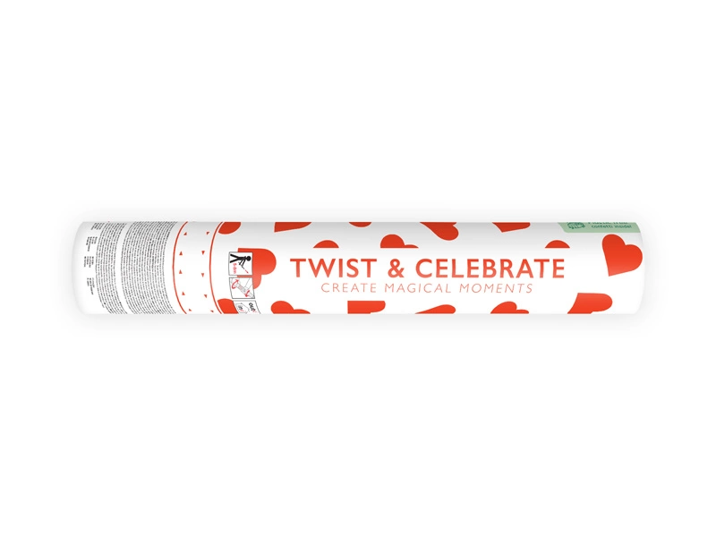 - Tuba strzelająca bibułowymi sercami w kolorze czerwonym, długość 28 centymetrów.