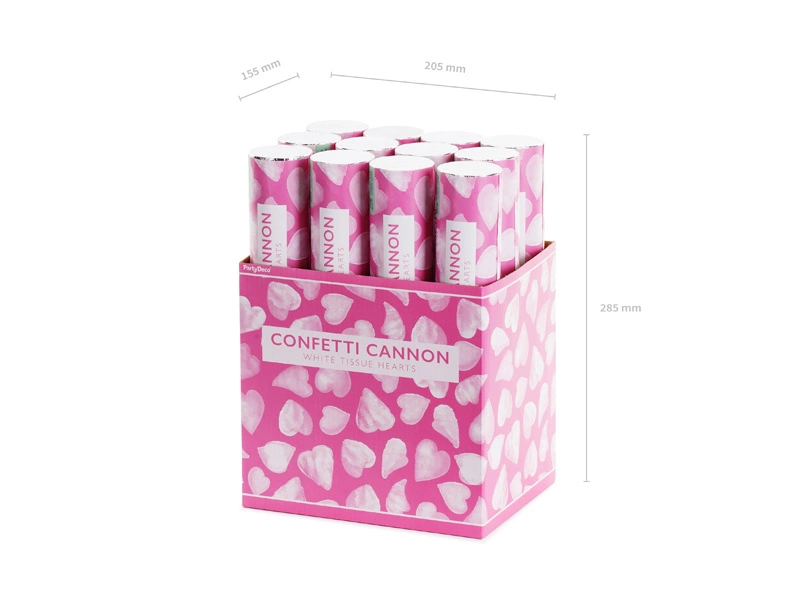 - Tuba strzelająca bibułowymi sercami w kolorze białym, długość 28 centymetrów.
