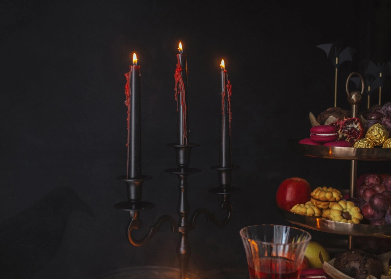 Pro Tip: Aby uzyskać jeszcze bardziej dramatyczny efekt, umieść świece na lustrzanej tacy. Odbicie w lustrze wzmocni efekt krwawiącego wosku i doda głębi dekoracji.