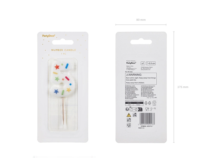 Dodaj wyjątkowy akcent do każdej urodzinowej imprezy dzięki świeczce urodzinowej w kształcie cyfry "5". Ta elegancka świeczka w kolorze białym z konfetti to idealny sposób na uczczenie piątych urodzin lub innej rocznicy. Dzięki drewnianemu patyczkowi, świeczka jest łatwa do umieszczenia na torcie, a jej wysokość całkowita wynosi około 10 cm, co sprawia, że jest doskonale widoczna.