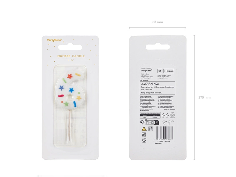 Świeczka urodzinowa Cyfra "6" z konfetti to doskonały wybór na każdą urodzinową uroczystość. Jej subtelny biały kolor ozdobiony kolorowym konfetti wnosi odrobinę magii i radości do każdego tortu. Dzięki solidnemu drewnianemu patyczkowi, świeczka jest stabilna i łatwa do umieszczenia na torcie. Wysokość cyfry wynosi około 5.5 cm, a całkowita wysokość to około 10 cm, co zapewnia jej doskonałą widoczność.