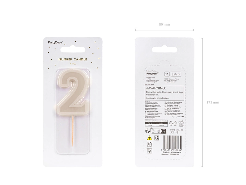 Dodaj wyjątkowy akcent do każdej uroczystości z naszą świeczką urodzinową w kształcie cyferki 2. Ta elegancka świeczka w subtelnym beżowym kolorze jest idealna na drugie urodziny lub jako część większej liczby. Dzięki swojej uniwersalności doskonale wpasuje się w każdą dekorację, a jej wysokość wynosząca około 6 cm czyni ją idealnym dodatkiem na tort.