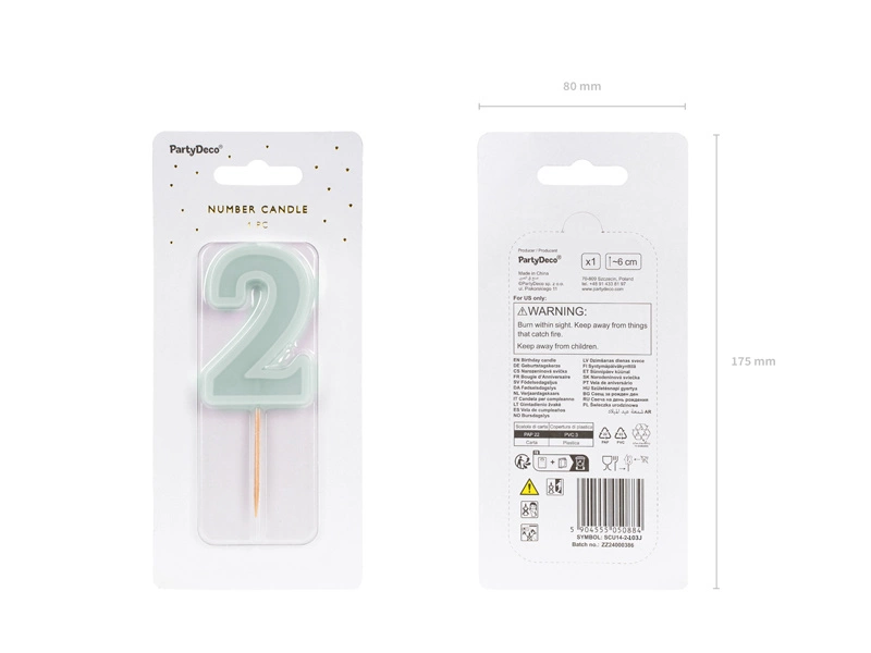 Wprowadź wyjątkowy akcent do urodzinowego tortu dzięki świeczce w kształcie cyferki 2, która zachwyca subtelnym, jasnomiętowym kolorem. Doskonała na drugie urodziny lub jako część większej liczby, ta świeczka o wysokości 6 cm stanie się nieodłącznym elementem każdej urodzinowej dekoracji.