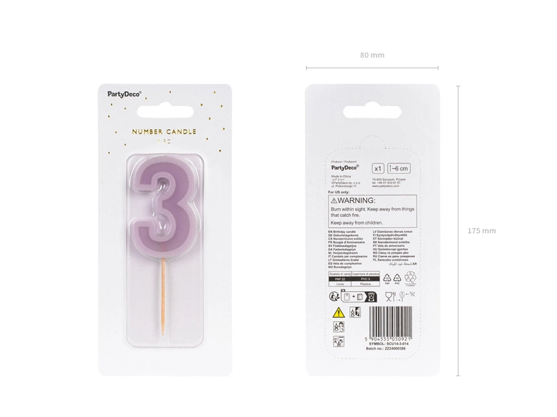 Przygotuj się na wyjątkowe urodziny z naszą świeczką w kształcie cyfry 3! Jej intensywny fioletowy kolor i wysokość 6 cm sprawią, że stanie się ona centralnym punktem każdej urodzinowej dekoracji, dodając jej niepowtarzalnego uroku i magii.