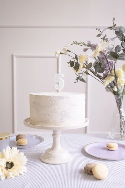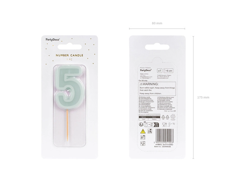 Dodaj wyjątkowy akcent do urodzinowego tortu dzięki świeczce urodzinowej w kształcie cyferki 5. Jej subtelny, jasnomiętowy kolor wprowadzi elegancję i świeżość do każdej imprezy, niezależnie od okazji. Idealna na piąte urodziny lub jako część większej liczby, ta świeczka stanie się nieodłącznym elementem Twojej dekoracji.