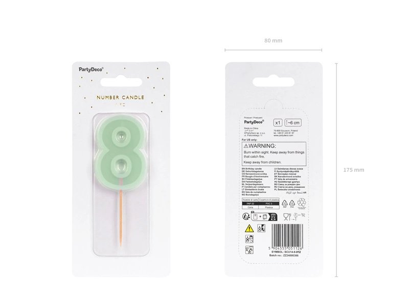 Dodaj wyjątkowy akcent do swojego przyjęcia urodzinowego dzięki świeczce urodzinowej w kształcie cyferki 8. Ta zielona świeczka o wysokości 6 cm to doskonały sposób na podkreślenie wieku solenizanta i dodanie koloru do tortu. Idealna na urodziny dzieci i dorosłych, wprowadza radosny nastrój i jest łatwa w użyciu.