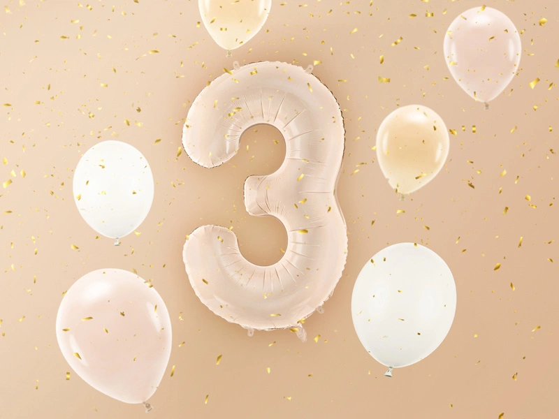 Dodaj odrobinę magii do swojej imprezy z naszym balonem foliowym w kształcie cyfry "3"! Ten elegancki, ciemnobeżowy balon to doskonały wybór na urodziny, rocznice czy inne wyjątkowe wydarzenia. Jego subtelny kolor i imponujący rozmiar sprawią, że stanie się centralnym punktem każdej dekoracji.