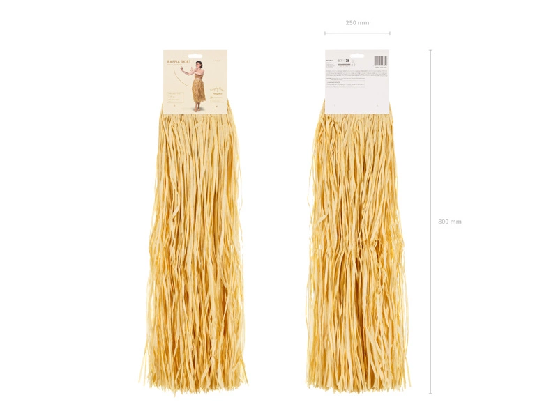 Spódnica jest w pięknym, naturalnym kolorze słomkowym, który doskonale wpisuje się w klimat tropikalnych imprez. Rozmiar uniwersalny dla dorosłych z elastyczną gumką w pasie zapewnia komfort noszenia. Długość spódnicy to 77 cm, a szerokość w pasie wynosi 31,5 cm.