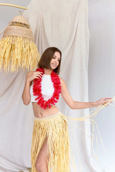 Nie czekaj dłużej! Dodaj naszą spódnicę hawajską z rafii do swojego koszyka i przygotuj się na niezapomnianą imprezę w tropikalnym stylu!
