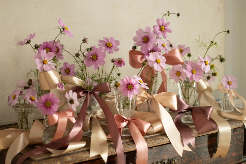 Użyj tasiemki do stworzenia pięknych kokard na krzesłach weselnych lub jako element dekoracyjny na stołach. Możesz również owinąć nią prezenty, dodając im eleganckiego wykończenia.