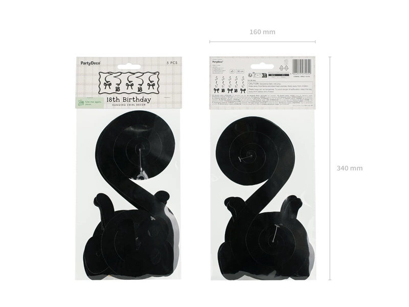 Planujesz niezapomniane 18 urodziny? Nasze czarne świderki z kokardkami to doskonały wybór, aby dodać elegancji i stylu Twojej imprezie. Zestaw zawiera pięć sztuk, które z łatwością zawiesisz dzięki bezbarwnym haczykom. Każdy świderek ma długość około 50 cm, co sprawia, że doskonale wypełnią przestrzeń nad stołem czy parkietem.