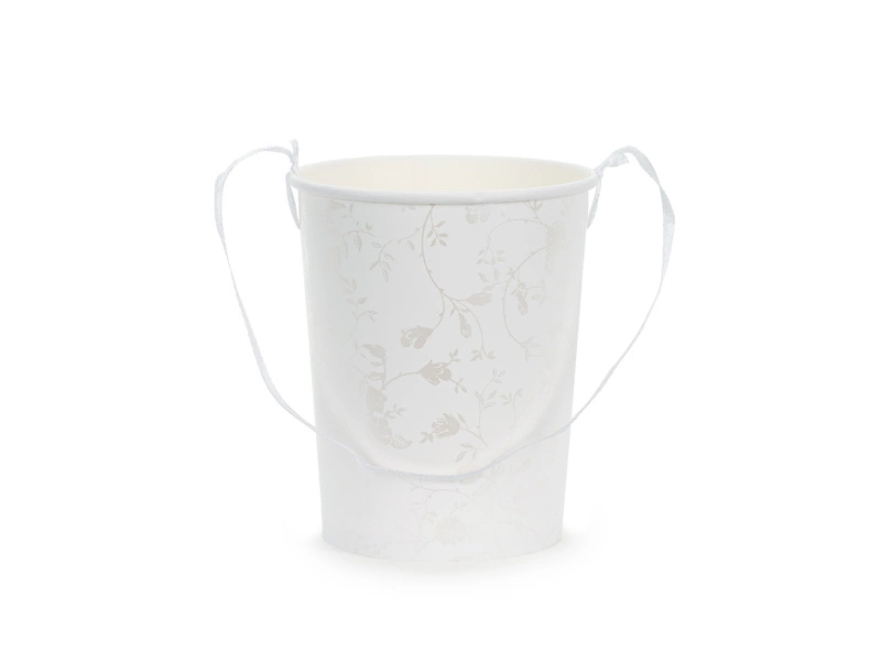 Idealne na wesela, to eleganckie białe wiaderko na płatki do sypania doda uroku każdej ceremonii. Wykonane z papieru, z subtelnym perłowym nadrukiem w kwiatki, stanowi doskonały dodatek do romantycznych chwil. W zestawie znajduje się biała, satynowa wstążka, która dodaje całości elegancji.
