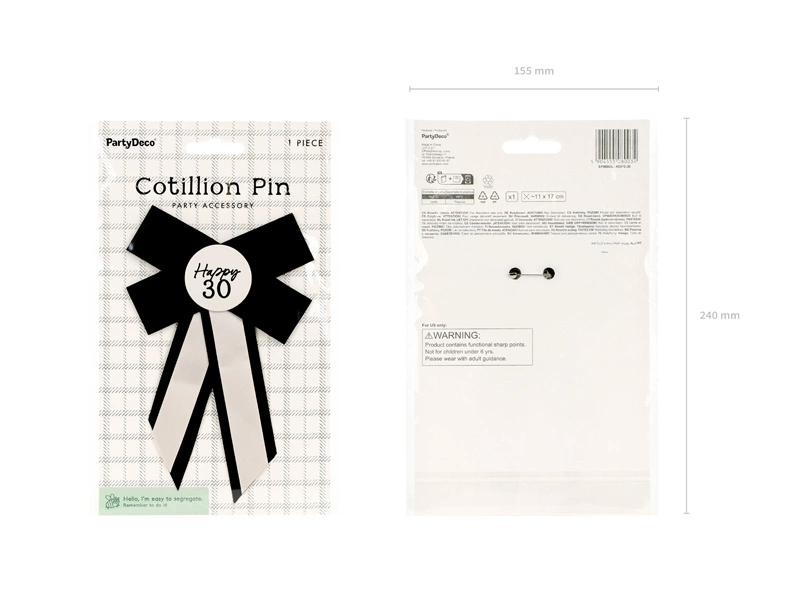 Świętuj swoje 30. urodziny z elegancją i stylem dzięki naszemu wyjątkowemu kotylionowi w kolorze kremowo-czarnym. Ten piękny dodatek doskonale podkreśli wyjątkowość Twojego jubileuszu, dodając mu odrobinę klasy i szyku. Idealny na przyjęcia urodzinowe, ten kotylion stanie się nieodłącznym elementem Twojej imprezy.