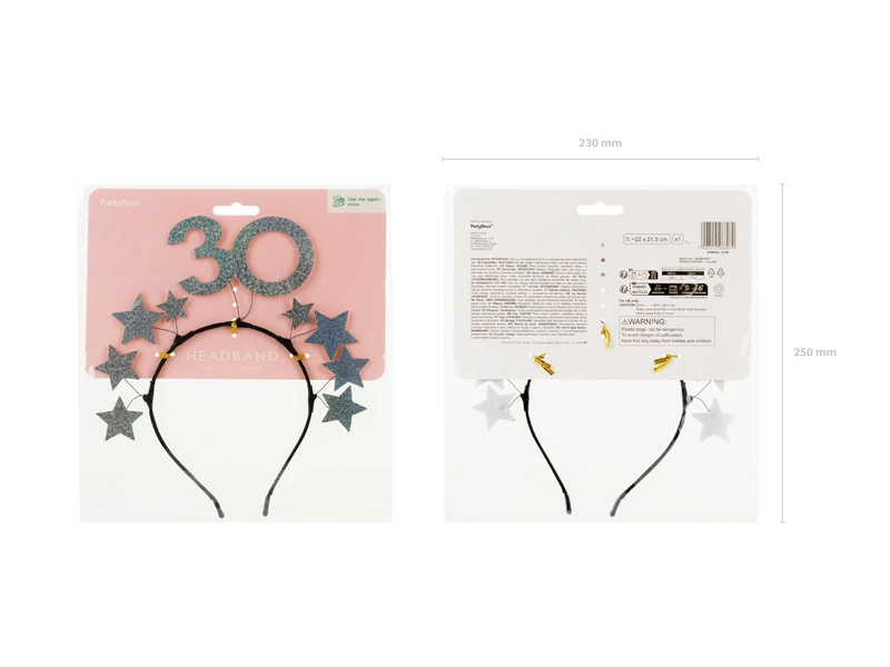Świętuj swoje 30. urodziny z wyjątkowym akcentem dzięki naszej opasce z gwiazdkami! Ta srebrna opaska to doskonały dodatek, który doda blasku każdej imprezie urodzinowej. Wykonana z wysokiej jakości materiałów, zapewnia komfort noszenia przez cały wieczór. **Kolor:** srebrny. **Rozmiar:** 22x21,5 cm. **Materiał:** metal.