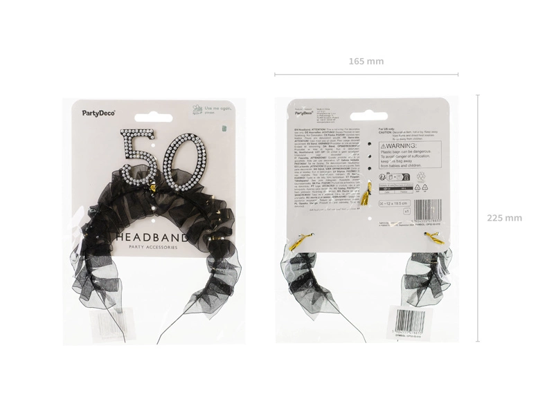 Świętuj swoje 50. urodziny z elegancją i stylem dzięki naszej wyjątkowej opasce z czarną falbanką i perełkami. Idealna na wieczór panieński, urodziny czy inne wyjątkowe okazje, ta opaska doda blasku każdej imprezie. **Kolor:** czarny, **Rozmiar:** 12 x 19,5 cm, **Materiał:** materiałowa.