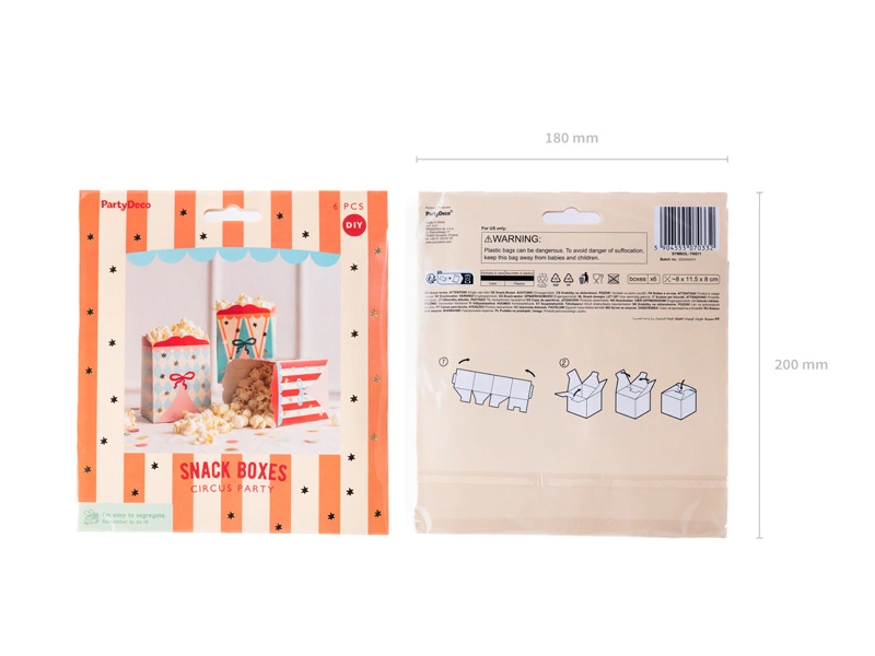 Przygotuj się na niezapomnianą imprezę z naszymi pudełkami na przekąski w stylu cyrkowym! Idealne na urodziny, wieczory panieńskie czy baby shower, te kolorowe pudełka dodadzą wyjątkowego charakteru każdemu przyjęciu. Wykonane z papieru, są nie tylko praktyczne, ale i ekologiczne. Zestaw zawiera 6 pudełek, które z łatwością złożysz samodzielnie.